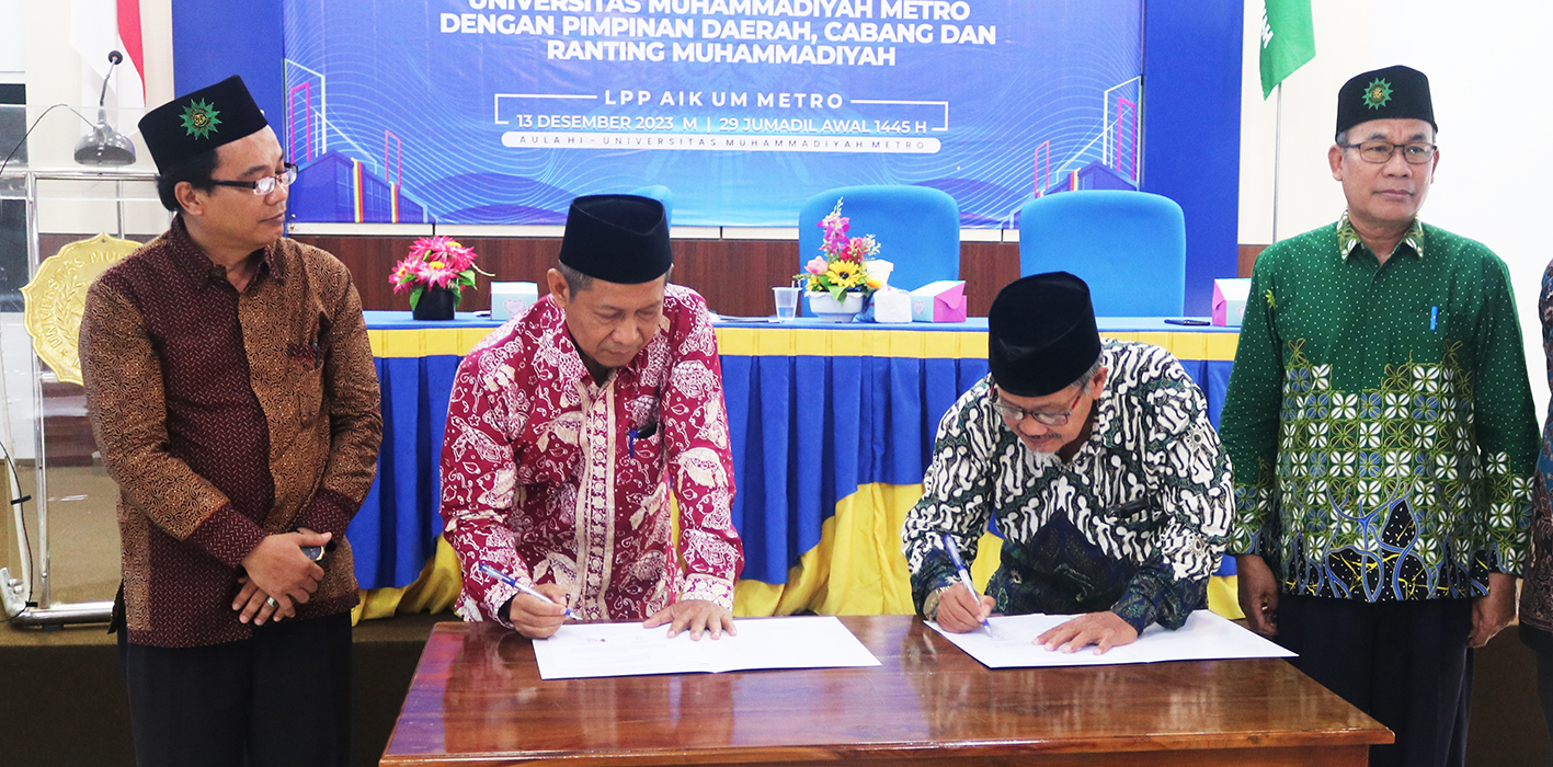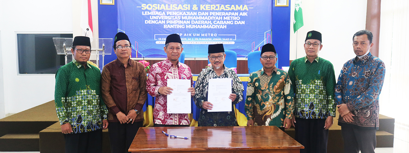 LPP AIK UM Metro bersama dengan Pimpinan Daerah Muhammadiyah (PDM) Lampung Timur bersama-sama sepakati dan tandatangani Nota Kesepahaman (MoU) (13/12). Nota Kesepahaman ini ditandatangani oleh Rektor UM Metro yaitu Dr. Nyoto Suseno, M.Si., dan Ketua PDM Lampung Timur yang diwakili oleh Bapak Dimyati, S.Ag.. Kegiatan ini diselenggarakan di Aula Gedung HI UM Metro.